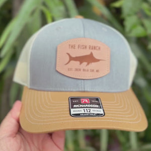 Built for days under the sun and nights swapping fish stories, the Fish Ranch Marlin Genuine Leather Patch Hat delivers old-school sea style with modern comfort. Featuring a laser-engraved marlin genuine leather patch on the Richardson 112 Tri Heather Grey/Birch/Amber Gold and Split Navy/Caramel, it’s a classic trucker built for life on and off the water.